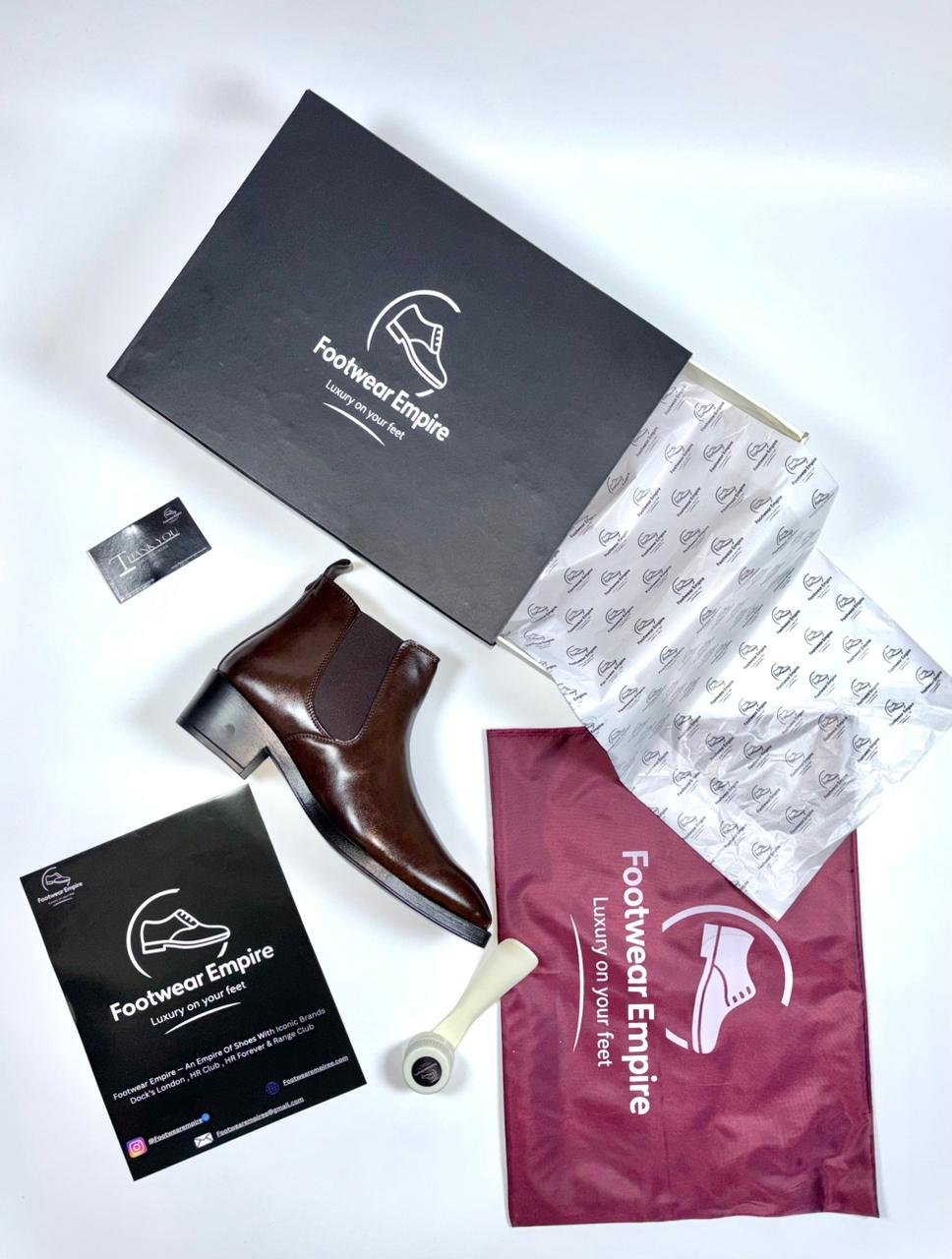 Premium Chelsea Boots made from 100% genuine crust leather with inbuilt Dr. Orthopedic socks for superior comfort. Comes with luxury packaging and essential care accessories.